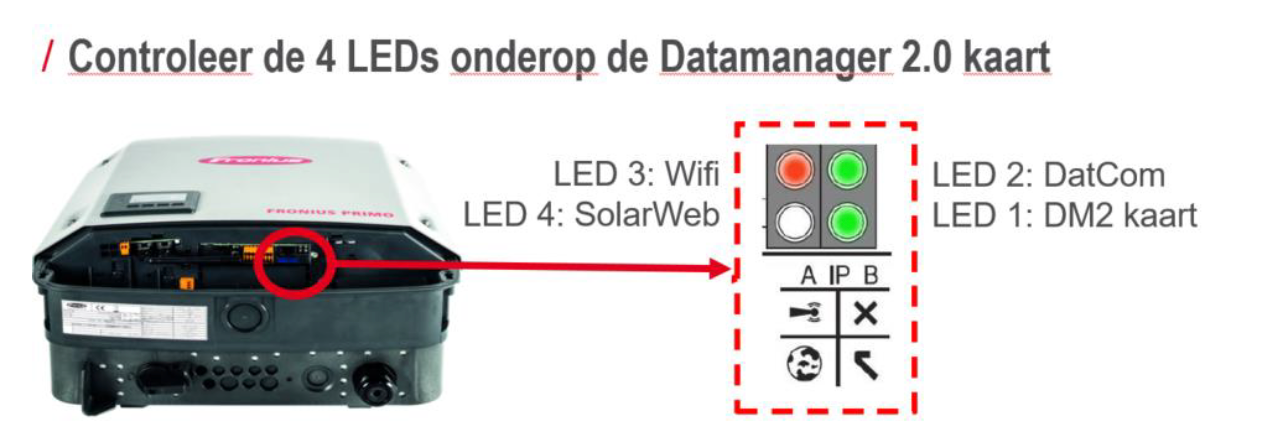Als de omvormer met wifi een goede verbinding heeft branden er 4 led’s groen. Als de omvormer met een LAN kabel verbinding heeft, branden er 3 led’s groen. Led 3 is dan rood er is immers geen wifi verbinding omdat je een Lan kabel gebruikt voor verbinding met internet.